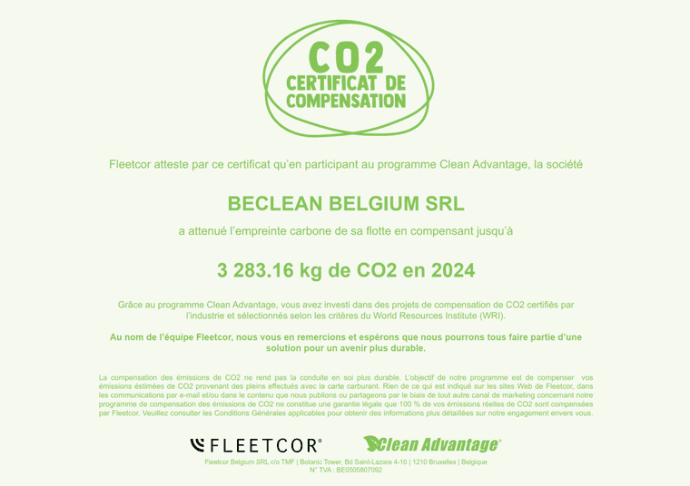 Chez BeClean, nous sommes fiers de vous annoncer notre engagement continu en faveur de l'environnement. Nous sommes ravis de partager avec vous le certificat de compensation CO2 que nous avons reçu de Shell, en collaboration avec Fleetcor et GreenPrint LLC, grâce à notre participation au programme Clean Advantage.
